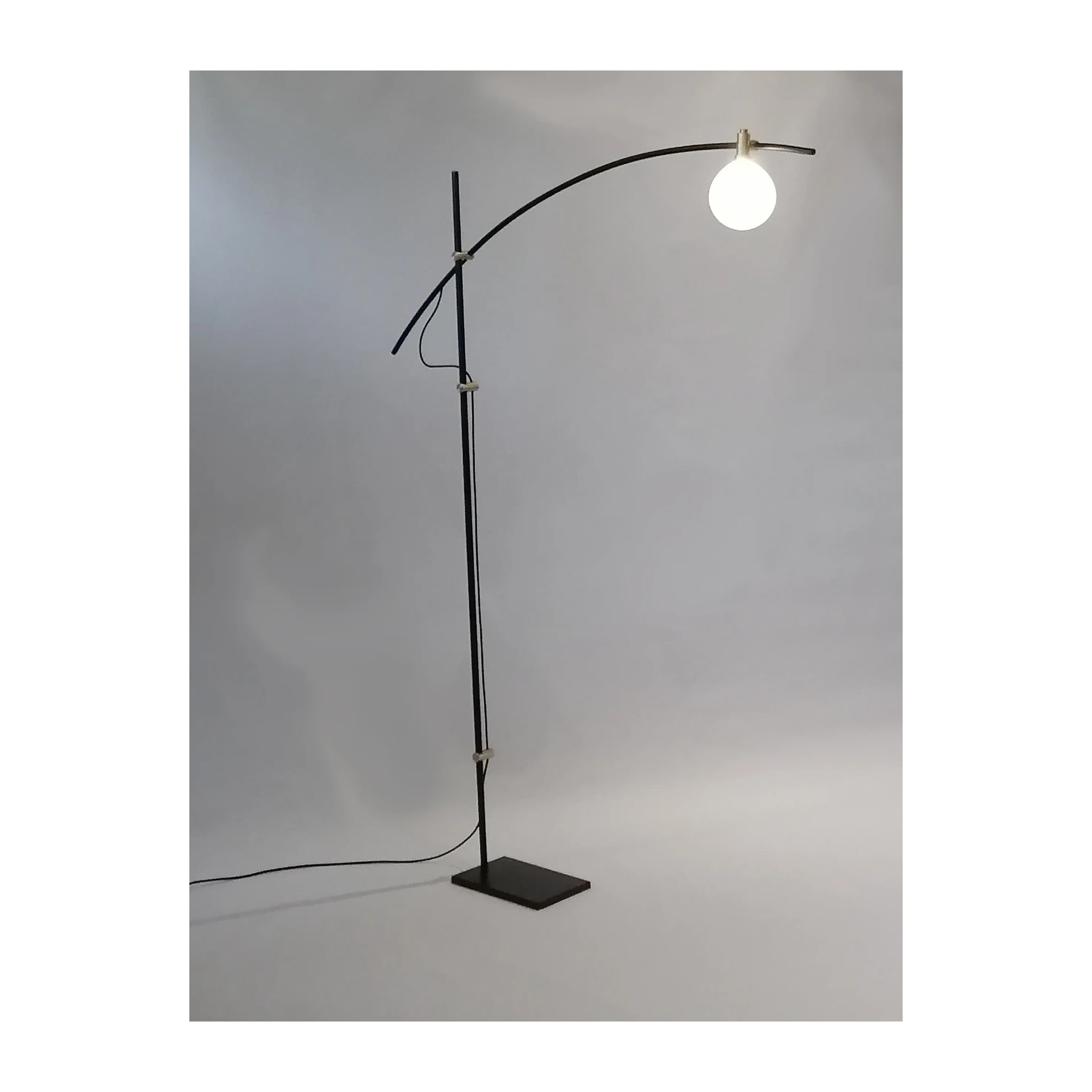 Lampara de pie con un alcance de 150 cm de radio y una altura variable, estructura en negro y uniones en bronce, cable textil exterior e interruptor de pie. Esta lampara es perfecta para acompañar espacios grandes y abiertos, al igual que zonas de reunión.